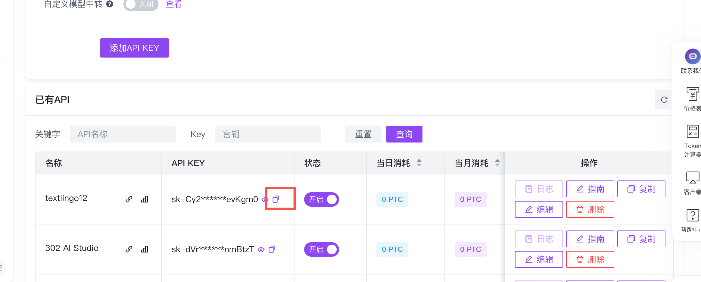 生成后,点击复制按钮将 API Key 保存到剪贴板。
