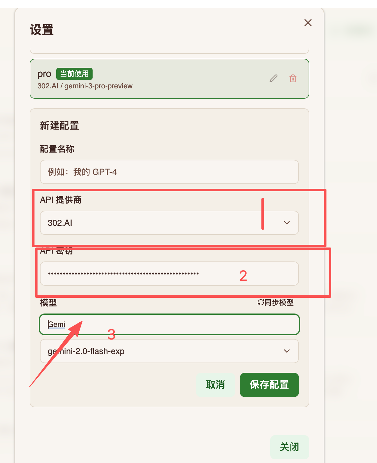 https://api.302.ai)。 - 模型筛选: 如下图所示,在模型名称处可以直接输入或筛选您需要的模型。我们推荐搜索并使用 gemini-3-flash 和 gemini-3-pro。