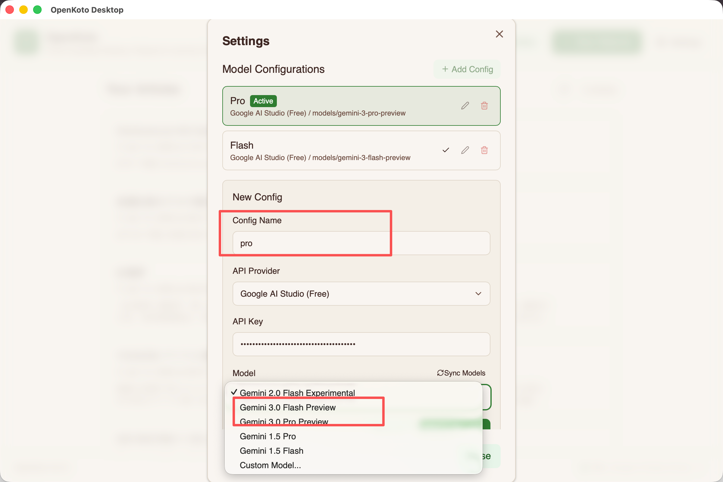 打开 OpenKoto,进入 设置 > 模型提供商,选择 Google AI Studio。粘贴您的 API Key。