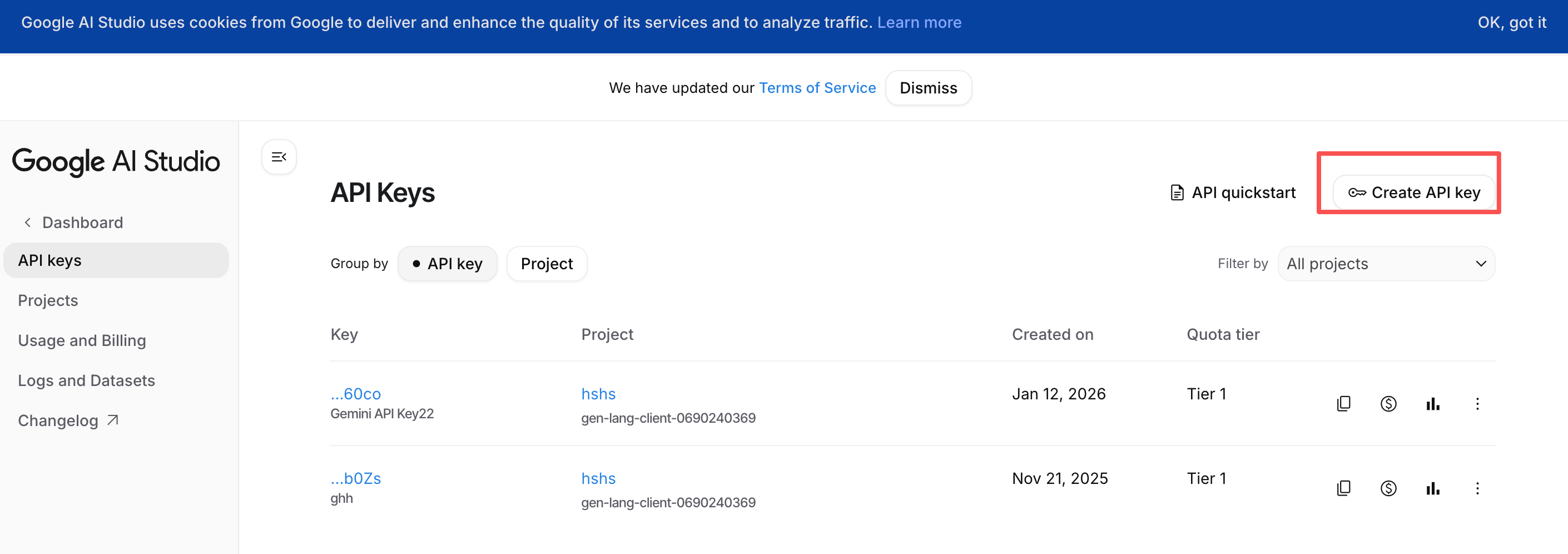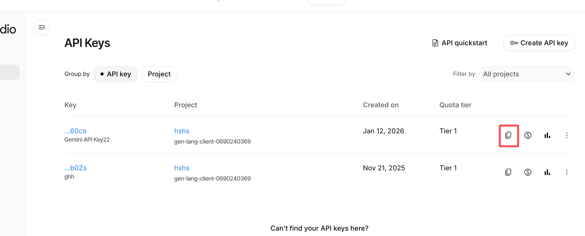 点击左上角的 "Get API key" 按钮,或主视图中的 "Create API key"。