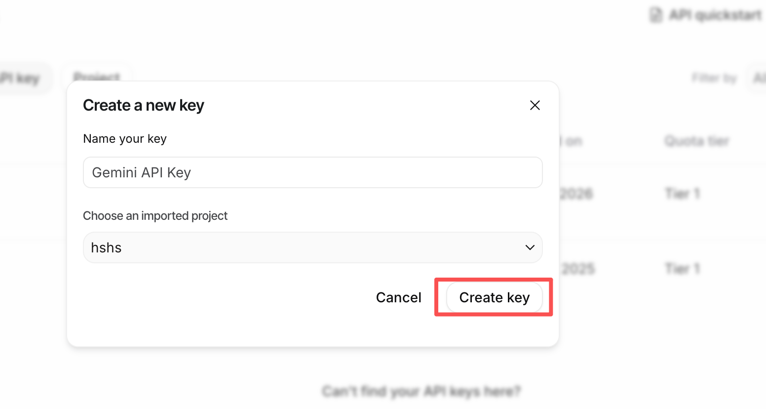 如果您还没有项目,请选择 "Create API key in new project"(在新项目中创建 API Key)。